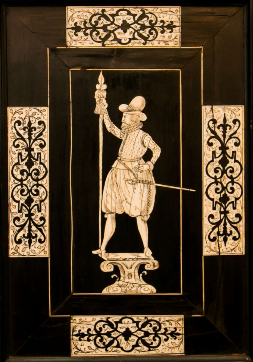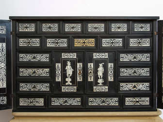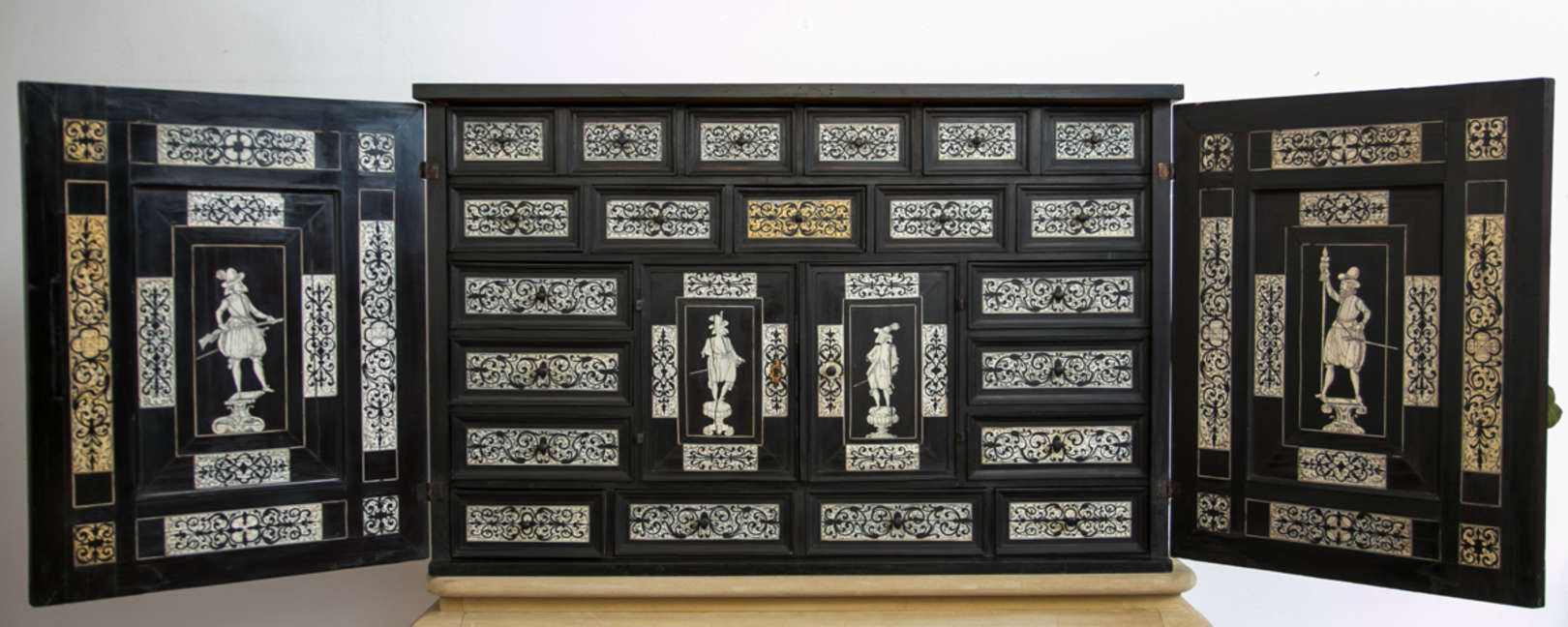 Bargueño hispano-flamengo de ébano e marfim depositado durante a colonização espanhola em convento do Alto Peru. Possivelmente século XVII. Apresenta estrutura paralelepipédica, as ilhargas dotadas de alças em metal torneado, destinadas a transporte. Sua fachada é guardada por porta que se abre em duas folhas, a face externa decorada por intermédio de taracea com marfim ou material córneo congênere em duas molduras retangulares, uma contida na outra. Sob esta porta em duas folhas, o espaço retangular é dividido em gavetas e dotado de um nicho central o qual também se abre em porta de duas folhas, todo ele adornado por trabalhos de taracea em arabescos, obtidos pela combinação de marfim ou outro material córneo e ébano. Cada uma das duas folhas da porta que dá acesso ao interior do nicho é decorada, em meio aos arabescos já citados, por duas placas retangulares de disposição vertical, em marfim ou material congênere, com um espadachim vestido em trajes seiscentistas, obtidos igualmente pela técnica da taracea. Há, na linha superior, seis gavetas. Abaixo, na segunda linha, o comprimento de cada gaveta aumenta e, por conseguinte, seu número diminui: são cinco. Abaixo, flanqueando o aludido nicho, há duas prumadas de três caixas superpostas. Abaixo, na fila inferior, acoplada à linha de base, há, aparentemente, quatro gavetas flanqueadas, mas que na realidade são três, já que as duas centrais abrem-se apenas numa gaveta única. Puxadores torneados em madeira. A face interna de cada uma das folhas da porta que fecha a caixa deste móvel recebe decoração análoga, mas mais exuberante; nela, os arabescos são equilibrados com a presença de lambrequins e quadrifólios, e os espaços retangulares são complementados por espaços quadrados. Sobre retângulo centralizando cada uma das faces internas de cada folha , vê-se, à esquerda, um arcabuzeiro em trajes seiscentistas, e à direita, um alabardeiro com indumentária idêntica. Estes móveis, de origem espanhola, possivelmente devem seu nome ao gentílico da aldeia de Bargas, perto de Toledo. Em outros países da Europa os bargueños são conhecidos como cabinets ou gabinetes, e incorporaram o mobiliário dos escritórios. Quando a fachada se move em 90 graus e se torna a superfície de trabalho, tais móveis configurariam os bargueños propriamente ditos. Se as gavetas ficam à mostra, não são cobertas, são chamados de contadores. Alguns dos exemplares mais antigos eram dotados de alças de metal sobre suas ilhargas para que pudessem ser transportados de um lugar a outro em lombo de besta. Dimensões: 0. 965 m. x 0. 62 m. x 0. 41 m.Lote 562 R$ 14.000 -