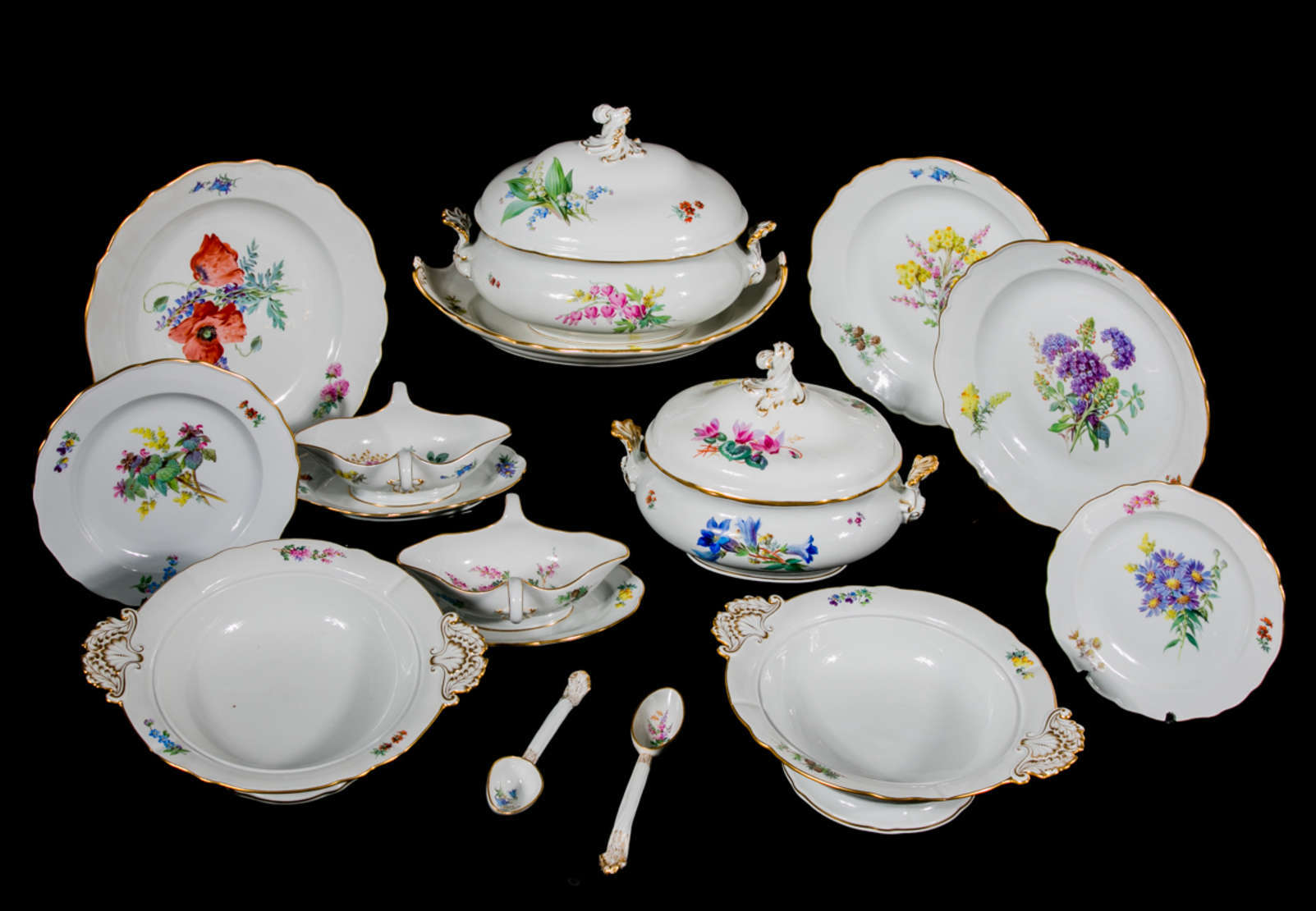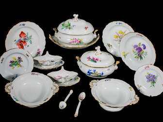 Remanescente de aparelho de jantar em porcelana de Meissen. Alemanha, séculos XIX e XX. Decoração de formato setecentista, com Deutsche Blumen em policromia. A terrina possui alças e pega em volutas barrocas realçadas de douradura. Todas as peças marcadas com as espadas azuis sob a coberta. Composto de: a. Vinte e quatro pratos rasos. Diâmetro: 0. 25 m. b. Seis pratos de sobremesa, um restaurado. Diâmetro: 0. 216 m. c. Duas molheiras ditas à double bec. Comprimento: 0. 26 m. d. Duas colheres. Comprimento: 0. 21 m. e. Sopeira com présentoir. Comprimentos: 0. 37 m. e 0. 42 m., respectivamente. f. Sopeira sem présentoir. Comprimento: 0. 33 m. g. Duas écuelles sem tampa. Comprimento (de alça a alça): 0. 33 m. h. Três pratos de servir, dois do mesmo tamanho. Diâmetros: 0. 347 m., o maior, e 0. 31 m., os menores.Lote 513 R$ 12.500 -