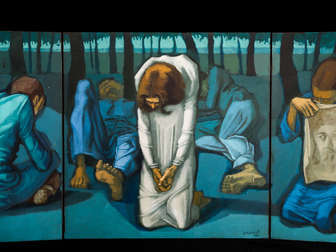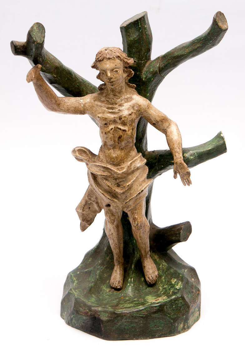 Imagem de São Sebastião entalhada, encarnada e pintada. dita da autoria do Mestre de Piranga. Minas Gerais, segunda metade do século XVIII. Apresenta São Sebastião de pé fixado a uma estrutura também entalhada em madeira e pintada que traz em um só bloco base de contexto rural da qual emerge uma árvore com quatro braços nus. São Sebastião aparece com o braço direito erguido, sugerindo estar amarrado a um dos braços da árvore, ao passo que o esquerdo, ainda que flectido em ângulo obtuso, apresenta a mão espalmada voltada para a linha de base. Fisionomia característica do trabalho deste artista, e caixa torácica deixando as costelas visíveis, idealizada de maneira um tanto ingênua. Belo cendal de grande movimentação barroca, análogo àqueles envergados por algumas imagens de crucifixo. Restauração em um dos braços. Mestre de Piranga é a designação dada ao suposto santeiro responsável pela fatura de todo um conjunto de imagens religiosas com estilemas análogos, procedente da cidade de Piranga ou da região mais abrangente do vale do rio Piranga, em Minas Gerais. De acordo com Beatriz Costa em sua obra Devoção e arte, as imagens com características da lavra do mestre de Piranga constituiriam integrantes de uma oficina da qual vários artesãos faziam parte. Ainda de acordo com a autora, há peças mais eruditas, com ricos estofamentos e douramento com as técnicas de pastilhos e punção, mas a grande maioria é formada por peças tendendo para o gosto popular, contingente que passou a ser conhecido pela designação de piranguinha. “As características gerais dessas imagens são certo ar ingênuo, feições às vezes negróides, olhos grandes e esbugalhados, com pálpebras salientes e certa tristeza no olhar. Algumas peças têm os olhos desnivelados, o nariz tem as narinas abertas, mas a linha central é reta”. Altura (até a extremidade do galho mais elevado): 0. 265 m.Lote 329 R$ 16.000 -