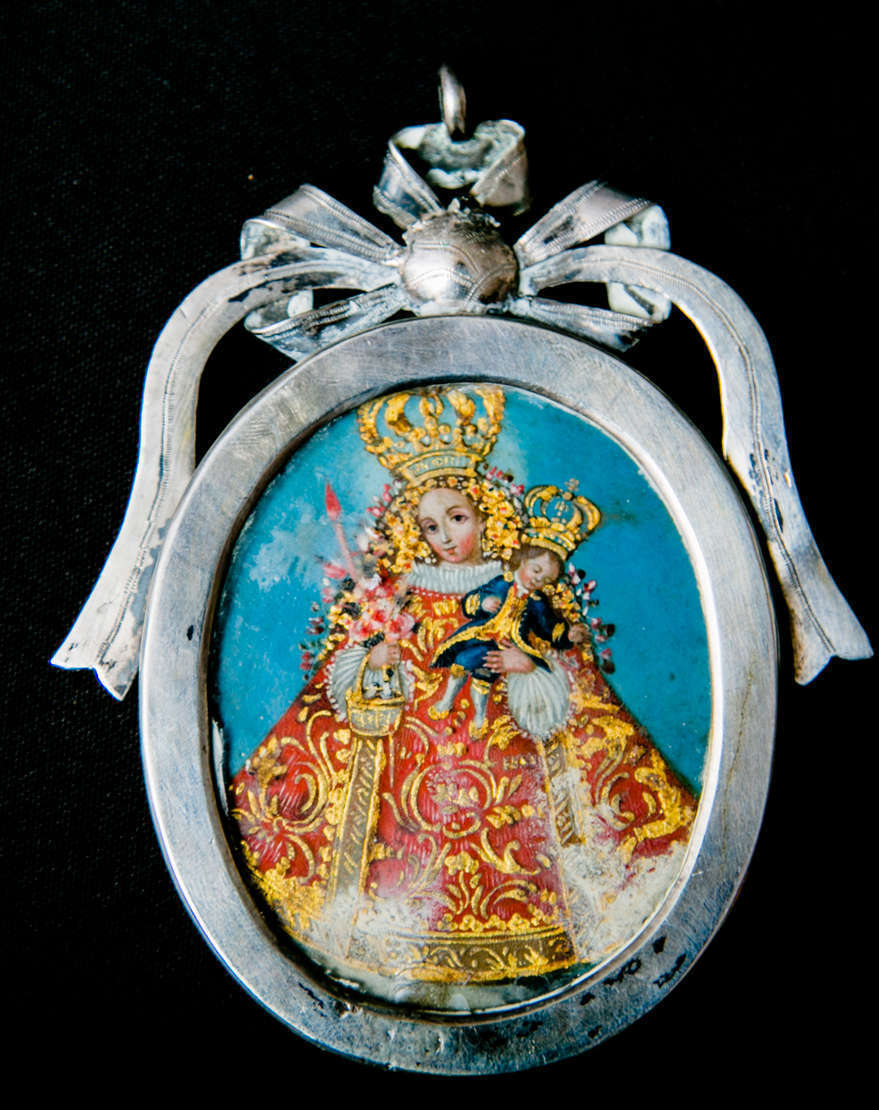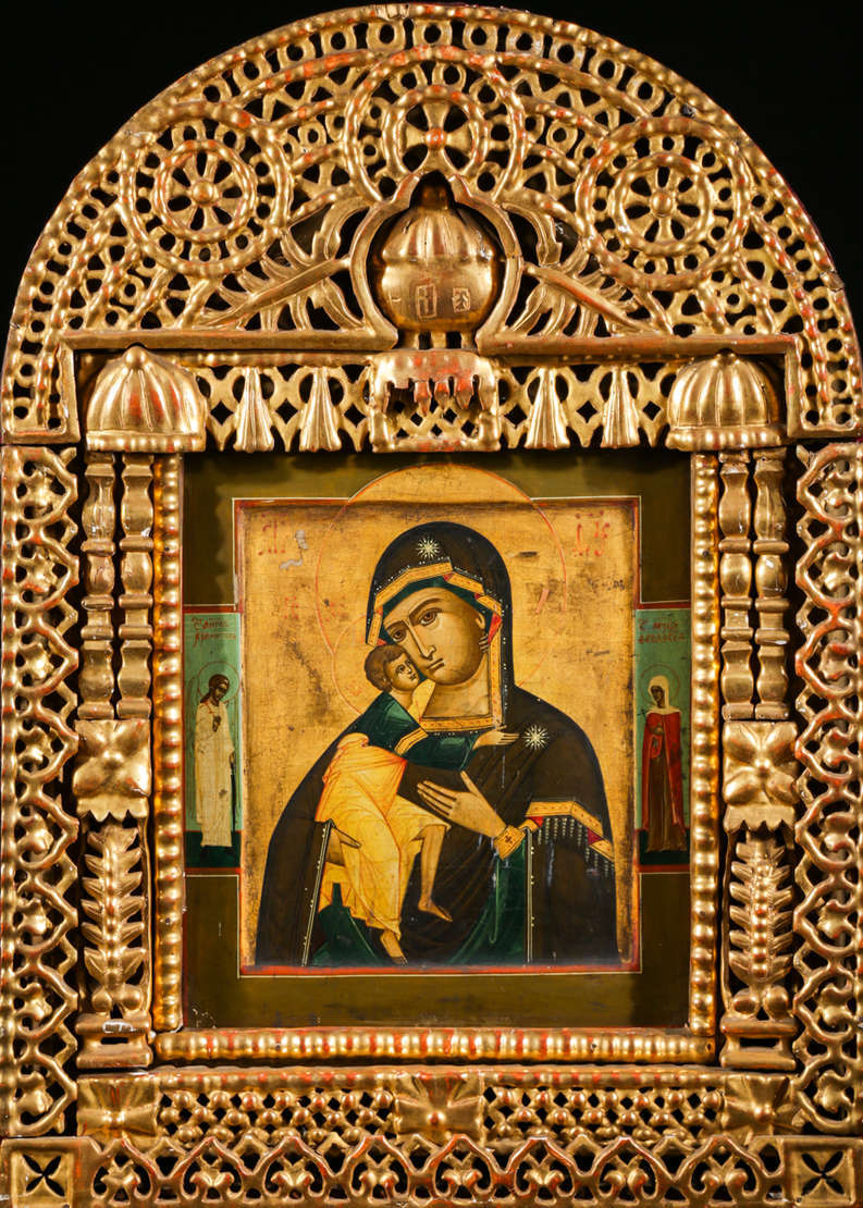 Ícone russo representando Nossa Senhora com o Menino Jesus. Século XVIII. Pintura e moldura esculpida e dourada com fixação de pão de ouro sobre a madeira, representando a mãe de Deus (Teodorowskaya). A representação do Menino Jesus desnutrido sinalizaria para o fato deste ícone ter sido pintado em época de muita miséria; a Divindade seria uma intercessão no caminho de superar tais momentos adversos. Do lado esuqerdo há um Anjo, do direito a Santra Mártir Teodósia (de devoção grega) o que parece indicar o nome do recepiendário da obra. A pintura foi realizada a base de têmpera sobre fundo branco. Medida interna: 0.35 m. x 0.30 m. Medida da moldura: 0.70 m. x 0.50 m.Lote 902 R$ 7.200 -