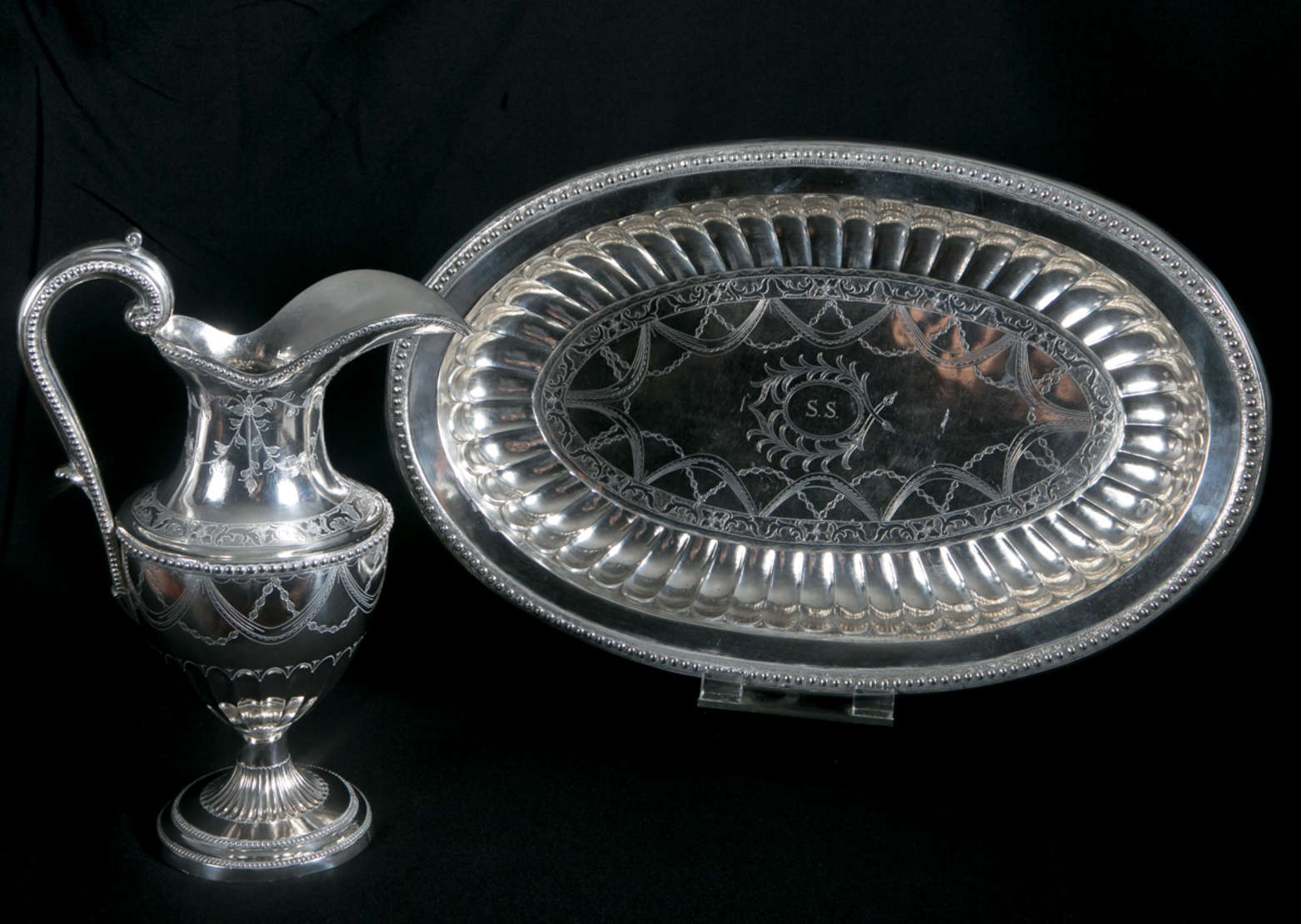 Gomil e bacia de água às mãos (ou lavanda) em prata brasileira. Minas Gerais, por volta de 1800. Reinado de D. Maria I (1777-1816) Elaborado em estilo neoclássico, este conjunto foi martelado, repuxado e cinzelado. O gomil apresenta formato de enócoa clássica, de tradição grega, com bocal movimentado, alça sinuosa, pescoço erguido de ombros em quebra, e pança afunilada, evoluída de nó em carretel sobreposto a pé circular. Alça sinuosa. Extremidades guarnecidas de fio perolado. Contornando os ombros, faixa com folhagens alternadas com flores sobre campo fosco. Sobre o pescoço, guirlandas cinzeladas, interrompidas sob o segmento de verter do bocal por reserva elíptica deixada muda, pendente de laço de fitas. Em torno da parte superior da pança, pendendo do fio perolado que contorna os ombros, festonné alternadamente sobreposto a motivo de chute de fleurs também disposto como elemento pendente. A parte inferior do bojo, abaixo da pança, é canelada, assim como o é também a parte central do pé, sob o nó. Na proximidade da linha de base, faixa de superfície côncava contornada, acima e abaixo, por dois fios perolados. Alça guarnecida, em seus dois lados, por fio perolado. A bacia de água às mãos apresenta formato elíptico, com extremidades contornadas por fio perolado, covo canelado e superfície central com reserva elíptica cercada por dois motivos palmiformes cinzelados, contendo as iniciais S. S. Na contiguidade do covo canelado, faixa com folhagens alternadas com flores sobre campo fosco, da qual se irradia motivo cinzelado com festonnés análogos aos que guarnecem a pança do gomil. Altura do gomil: 0. 31 m. Peso: 1092 g. Comprimento da bacia: 0; 455 m. Peso: 1028 g.Lote 556 R$ 16.000 -