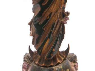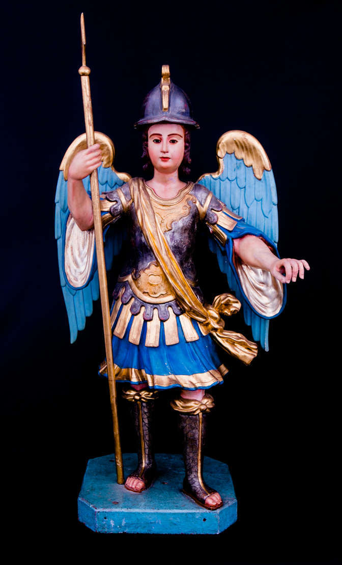 Imagem de São Miguel entalhada em madeira, policroma e dourada. Minas Gerais, início do século XIX. Apresenta asas relevadas com plumas e realçadas de douradura. Corpete sobre o saiote perpassado por faixa de douradura brunida amarrada em laço de bela movimentação sobre o quadril esquerdo, também dourado. Pernas cobertas por botas que deixam os pés parcialmente visíveis à altura dos dedos, e que são envolvidas por panejamento em torno de seus joelhos. A imagem traz lança e sua cabeça está coberto por elmo. Olhos de vidro. Base de quatro lados chanfrados. Altura: 0. 82 m.Lote 97 R$ 20.000 -