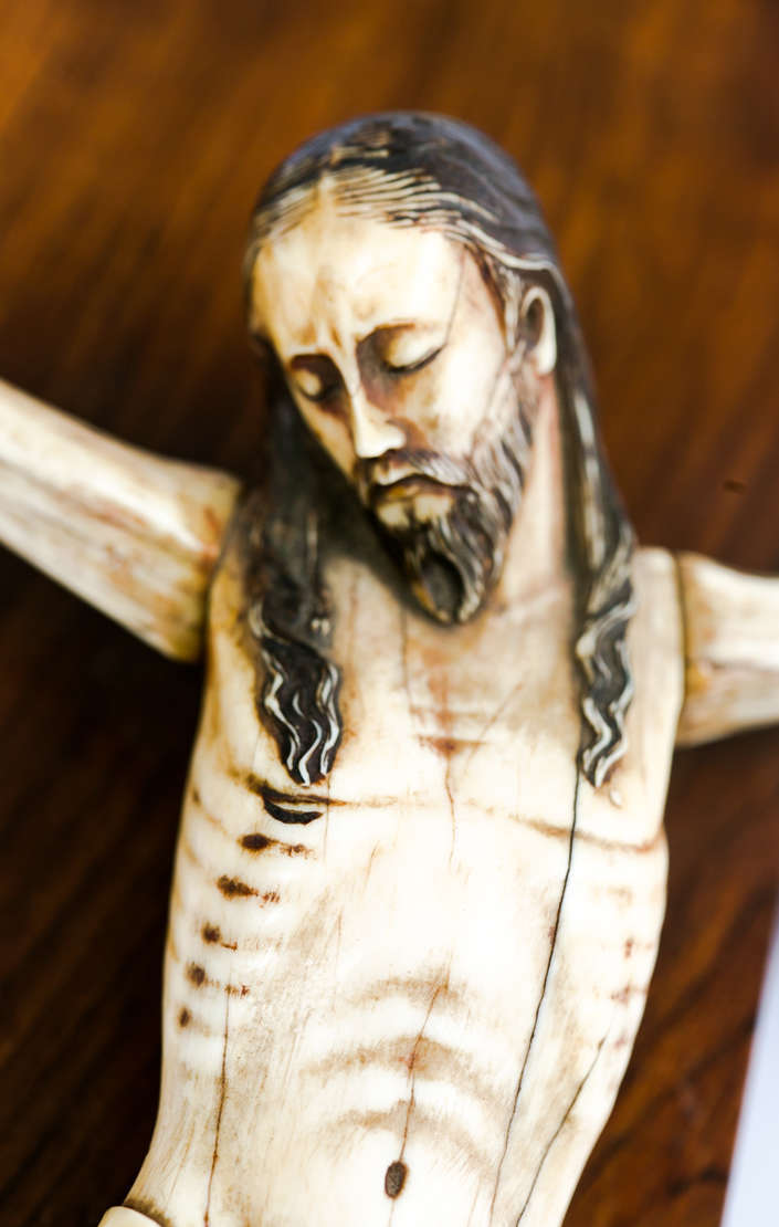 Crucifixo de origem européia com a imagem de Nosso Senhor Jesus Cristo entalhada em marfim. Século XIX. A cruz aprese...