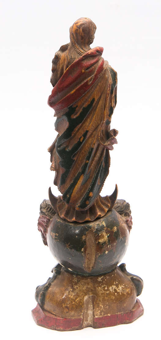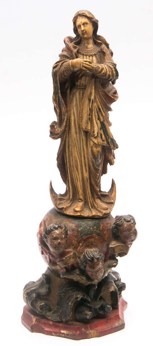 Imagem de Nossa Senhora entalhada em madeira e possivelmente repintada. Baviera, século XVIII. A Virgem aparece aqui ...