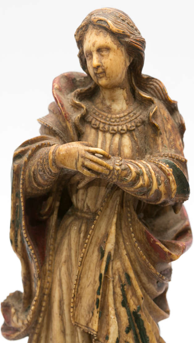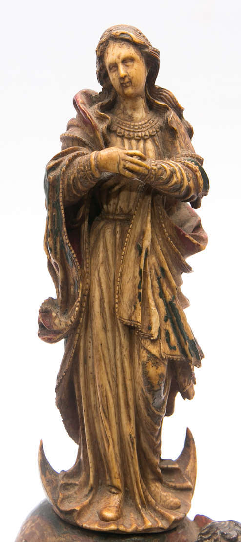 Imagem de Menino Jesus com o pé esquerdo sobre crânio entalhada em marfim. Espanha, possivelmente de sua colônia fili...