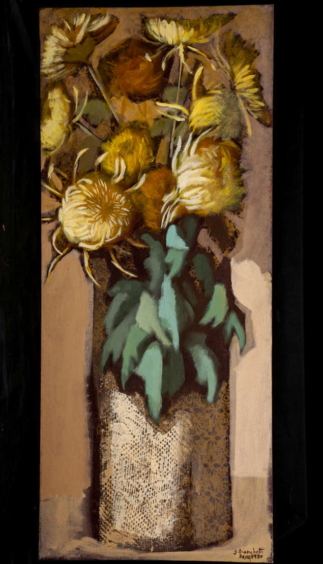 Glênio Alves Branco BIANCHETTI (Bagé, 1928 - Brasília, 2014). "Vaso de flores amarelas sobre cadeira". Acrílico sobre...