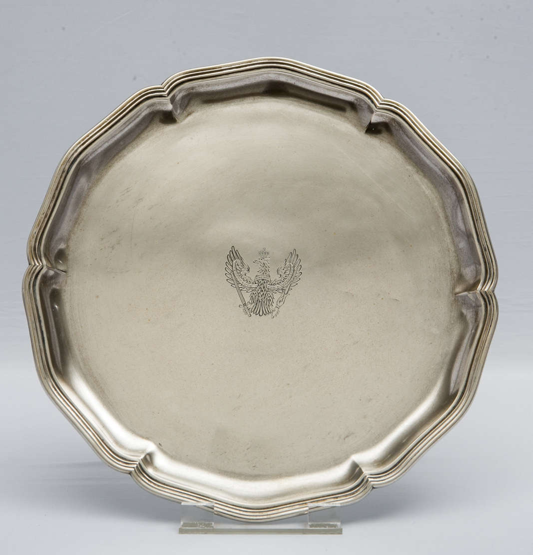 Prato de servir em prata alemã apresentando punção de garantia da coroa e da lua para teor 800 milésimos e posto em u...