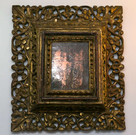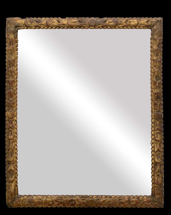 Espelho entalhado em madeira e dourado. Alto Peru, hoje Bolívia, século XVIII. Moldura vazada em motivos fitomorfos, ...