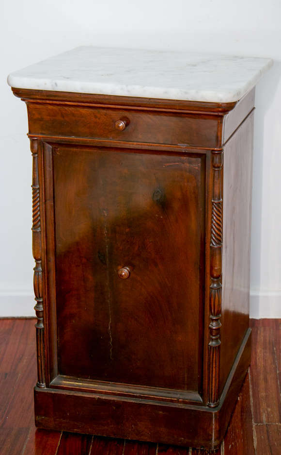Par de criados mudos com tampo em mármore. Europa, final do século XIX. Apresenta tampo em mármore de quinas dianteir...
