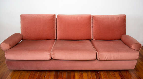 Conjunto composto por sofá e duas poltronas, estofados em tecido sintético de tonalidade ciclame. Comprimento do sofá...