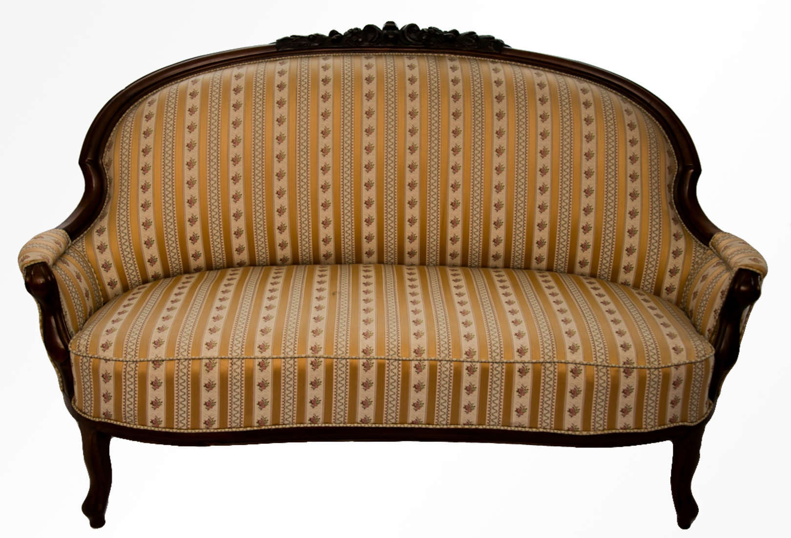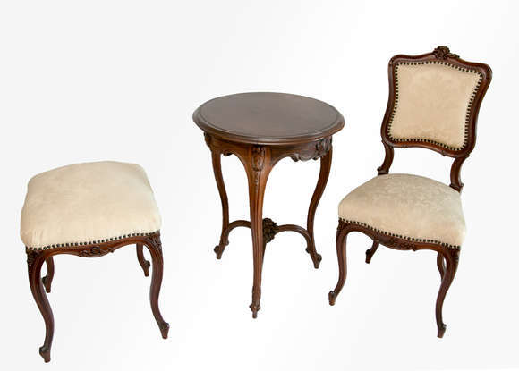 Conjunto composto de duas cadeiras, dois mochos, estofados em tecido, e uma mesa redonda em estilo neorrococó. Reint...