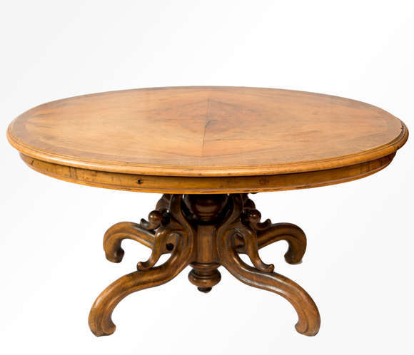 Mesa em estilo Biedermeier para frente de sofá. Europa central. Apresenta tampo de contorno elíptico, emoldurado, sob...