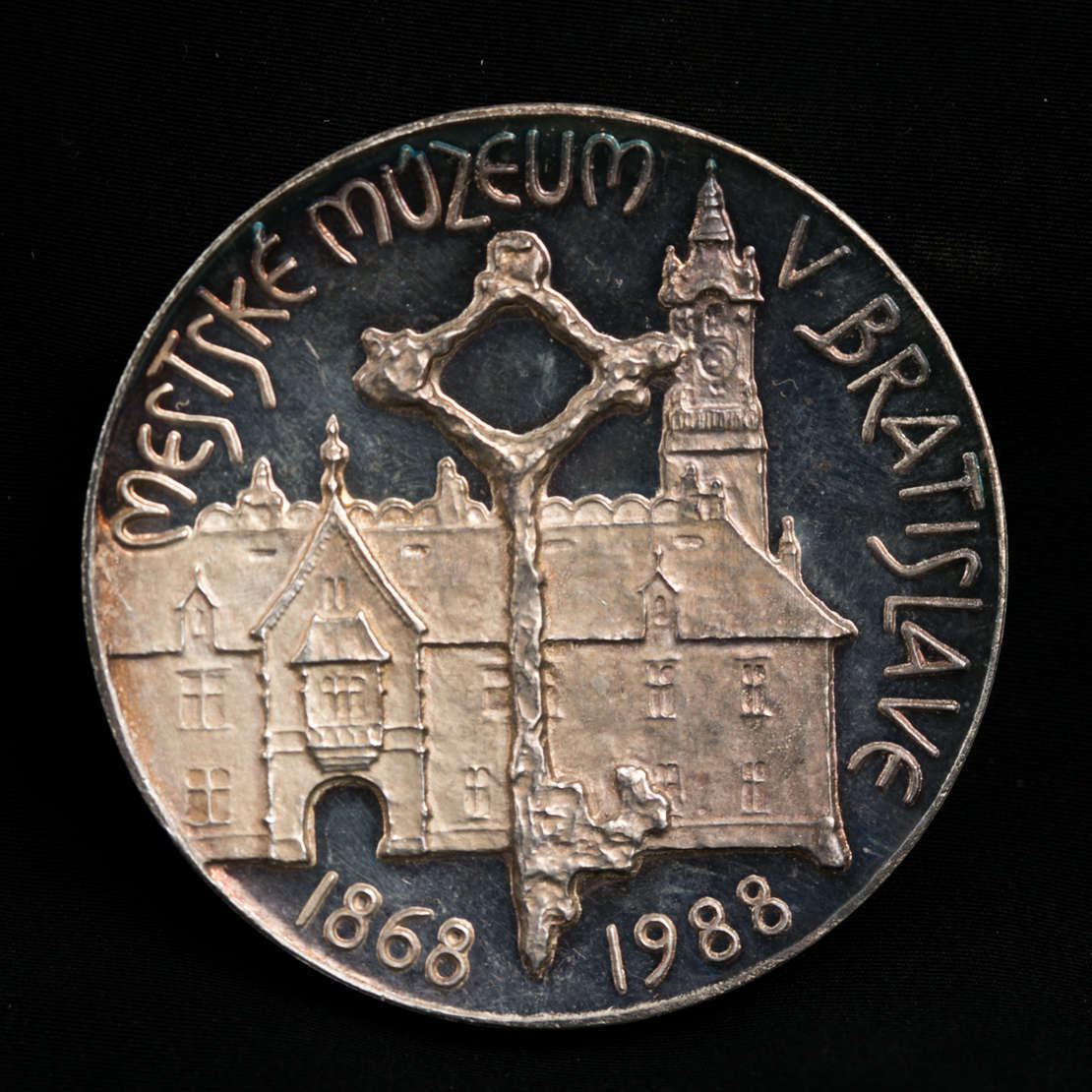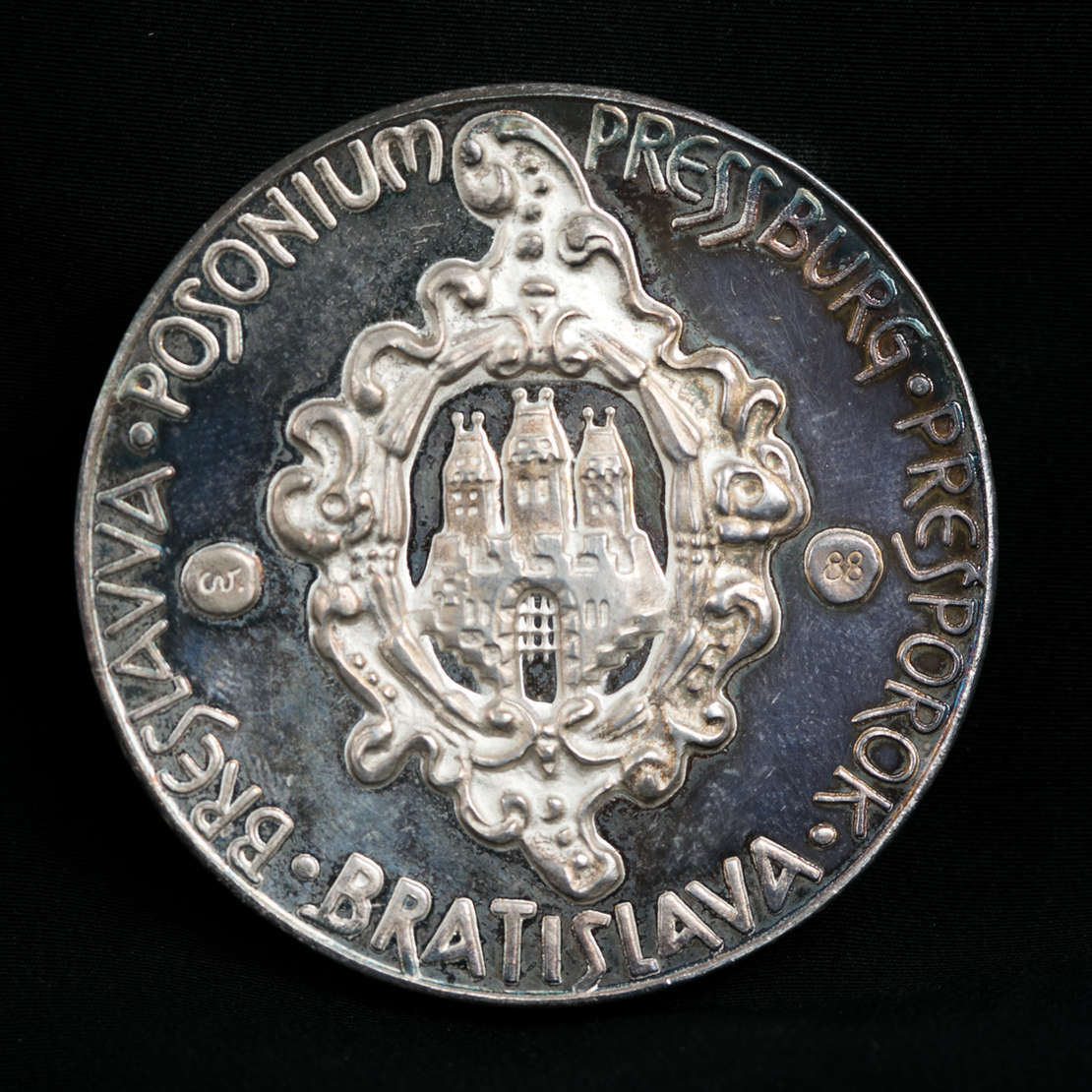 Medalha em prata alemã. Apresenta armas da cidade de Hamburgo, e sobre o reverso, embarcação setecentista circundada ...