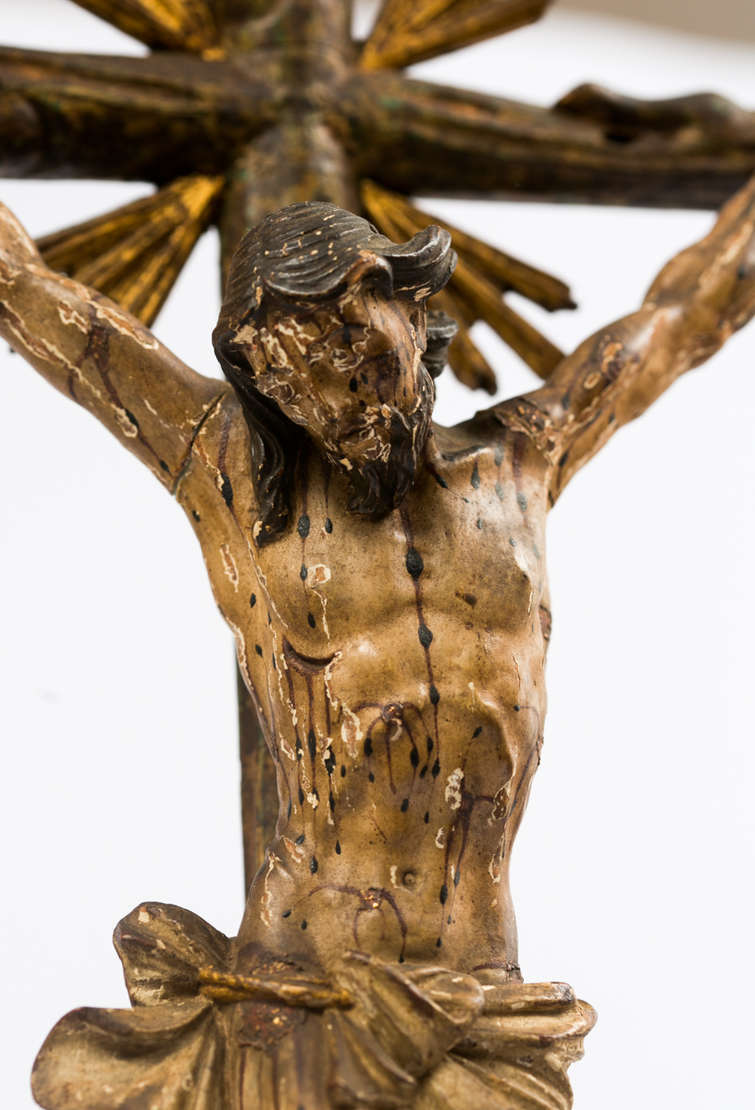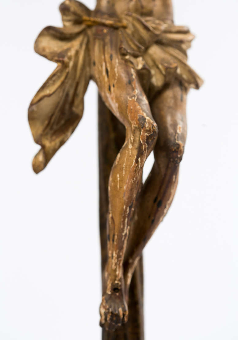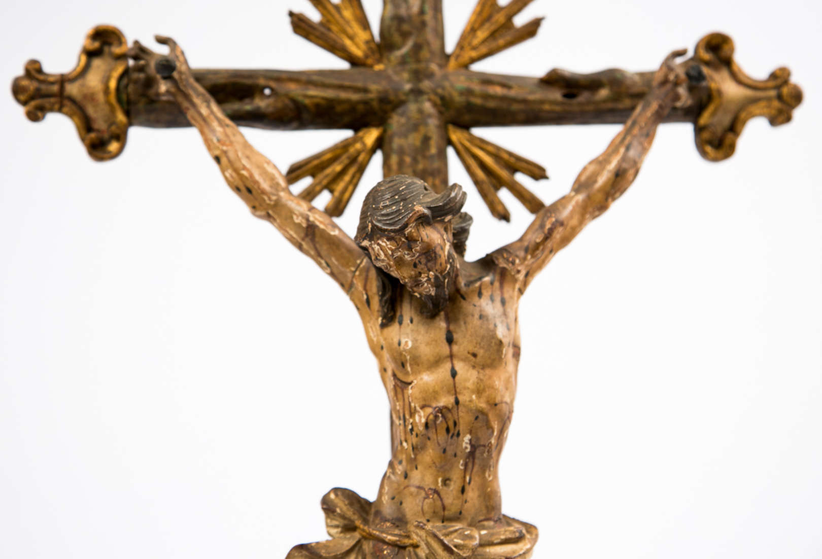 Crucifixo de origem européia com a imagem de Nosso Senhor Jesus Cristo entalhada em marfim. Século XIX. A cruz aprese...