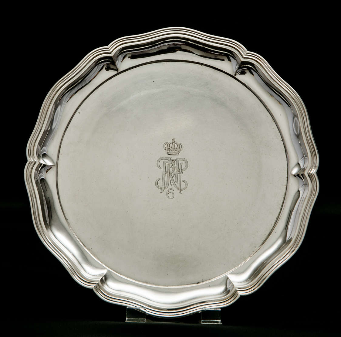 Prato de servir em prata alemã apresentando punção dito da coroa e da lua, para teor 800 milésimos, e posto em uso a...