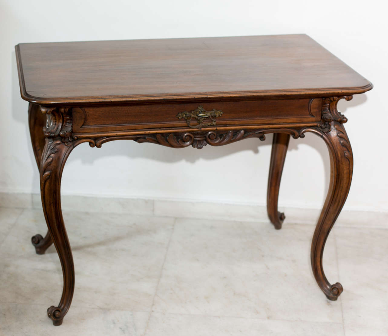 Mesa em estilo Biedermeier para frente de sofá. Europa central. Apresenta tampo de contorno elíptico, emoldurado, sob...