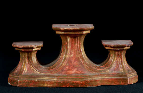 Base em madeira destinada a imagens de calvário, a saber, Nossa Senhora das Dores, a Cruz, ao centro, e São João Evan...