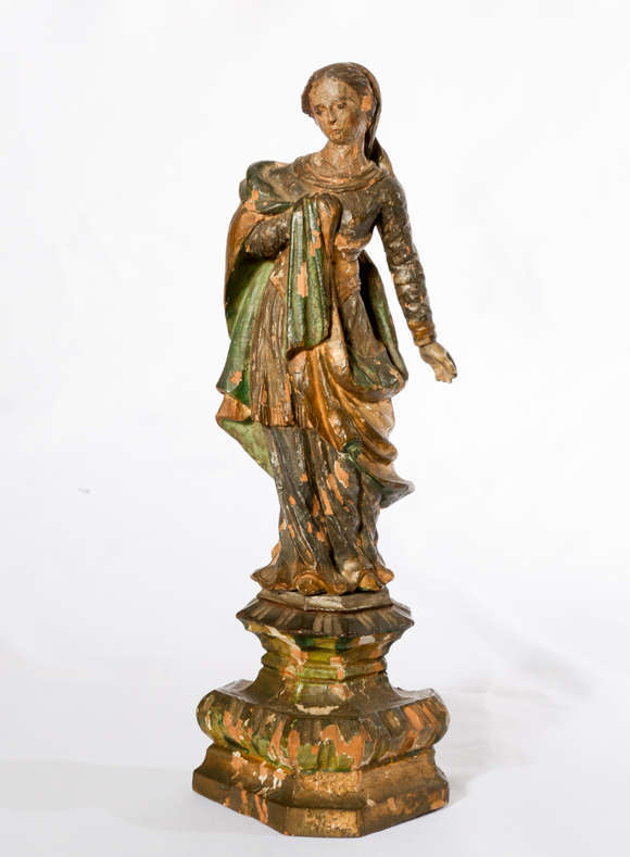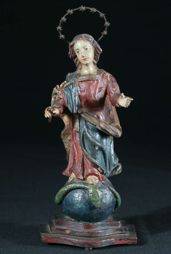 Imagem de Nossa Senhora entalhada em madeira e possivelmente repintada. Baviera, século XVIII. A Virgem aparece aqui ...