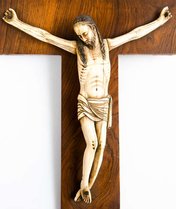 Crucifixo de origem européia com a imagem de Nosso Senhor Jesus Cristo entalhada em marfim. Século XIX. A cruz aprese...
